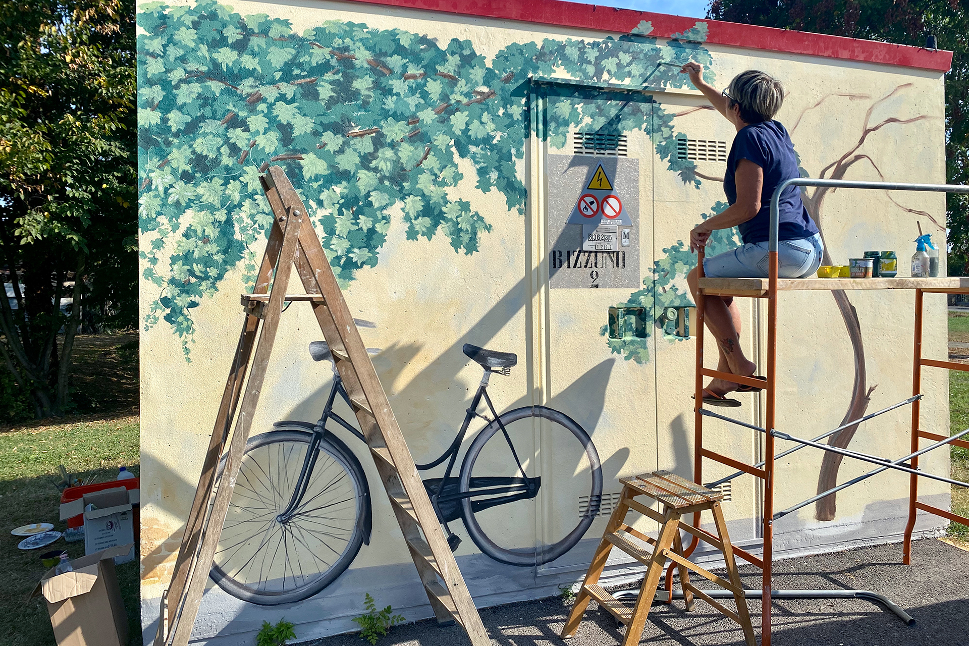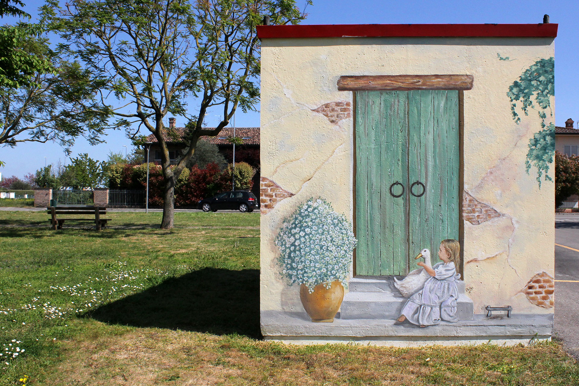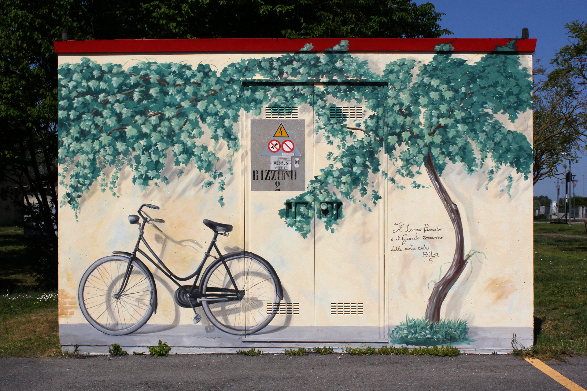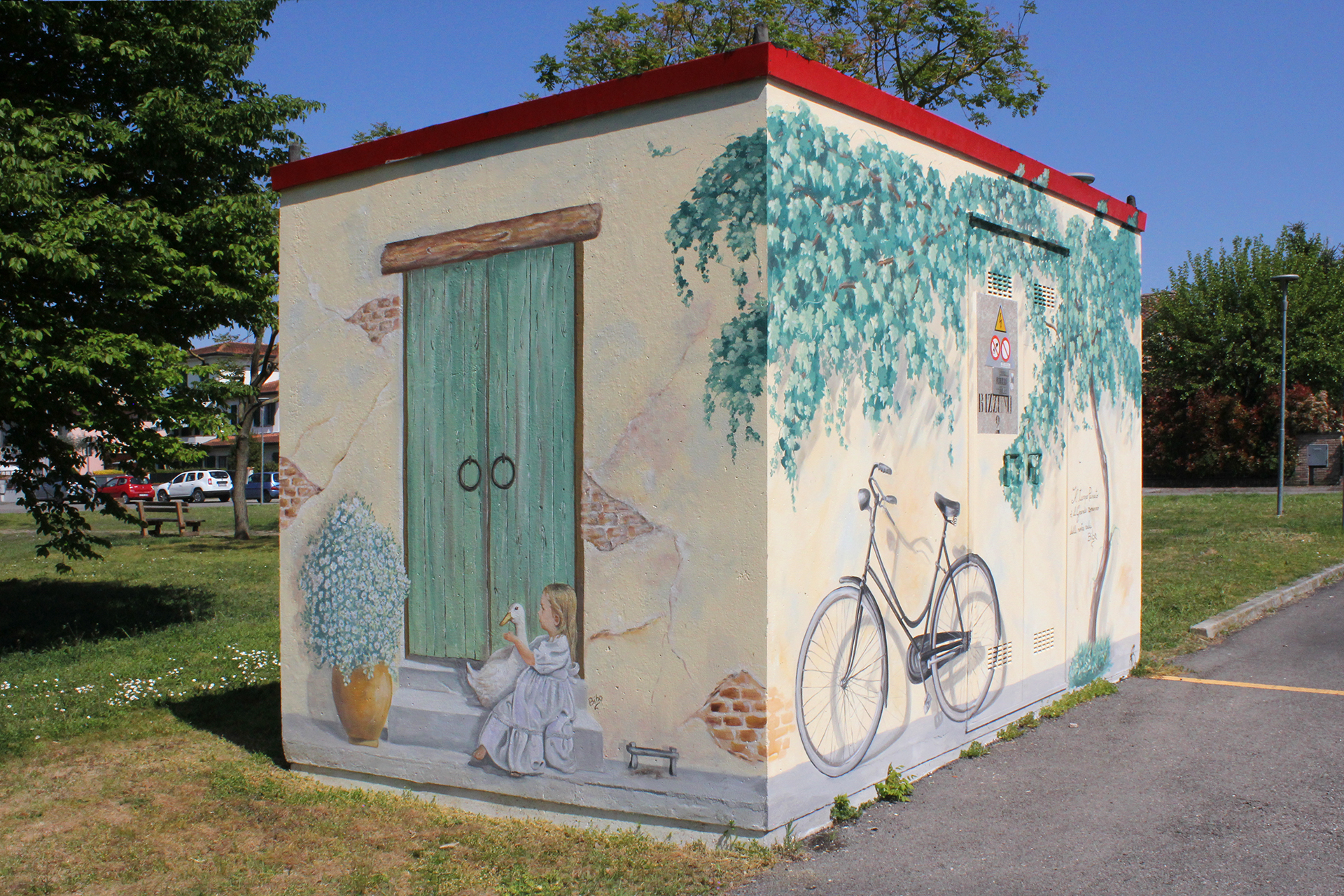 Non più la solita cabina dell’Enel. Per tutta la comunitá di Bizzuno di Lugo un’opera di grandi dimensioni realizzata da Biba per decorare con la pittura il grigiore di questi fabbricati. Scene che fanno rivivere la quotidianità dei momenti belli e spensierati. Fiori, animali, bambini, un parco di colori che riempiono il cuore e regalano un sorriso ad ogni sguardo e da ogni angolo.
