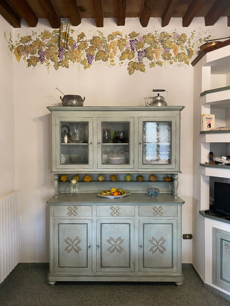 L’intreccio della vite rossa e bianca completa lo stile country chic di questo meraviglioso casolare situato nelle campagne bolognesi. Decorazione murale realizzata con colori acrilici.
